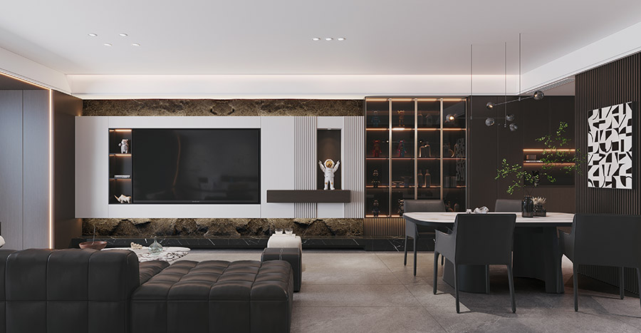 本案用中性色為基礎,搭配燈光來點綴構建了一個時尚與精致相結合的家宅,包裹業主對生活的感知與探索。屋里的配色、每一個物件,都是舒適的,能從中發現與居者之間的聯結。整體散發的氣息,展現奢華大氣又不失優雅,是對高品質的追求。